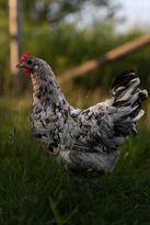 Silverudds are small birds with a smaller straight comb, dark eyes, and slate/willow legs. Offspring from our flock will be blue, black, or splash. We started our flock from three unrelated lines, ensuring the genetic diversity that is so important for this breed.